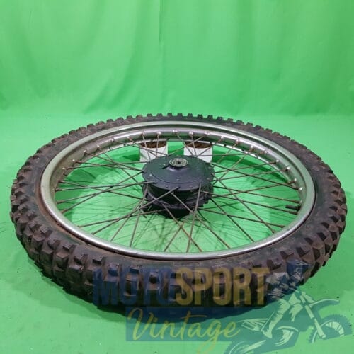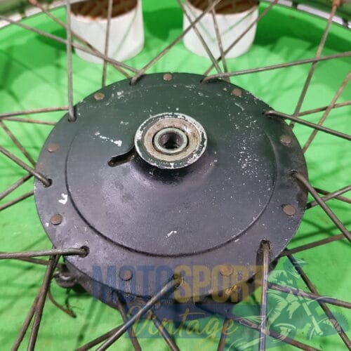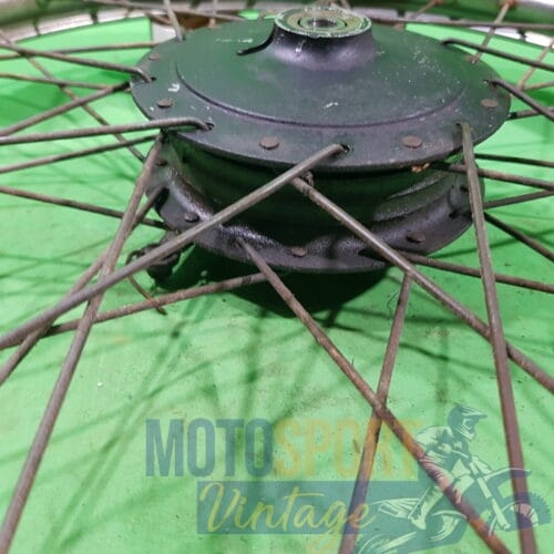 RUOTA ANTERIORE COMPLETA DI MOZZO TRADIZIONALE E CERCHIO IN FERRO RAGGIO 21 PER MOTO REGOLARITA’ CROSS EPOCA